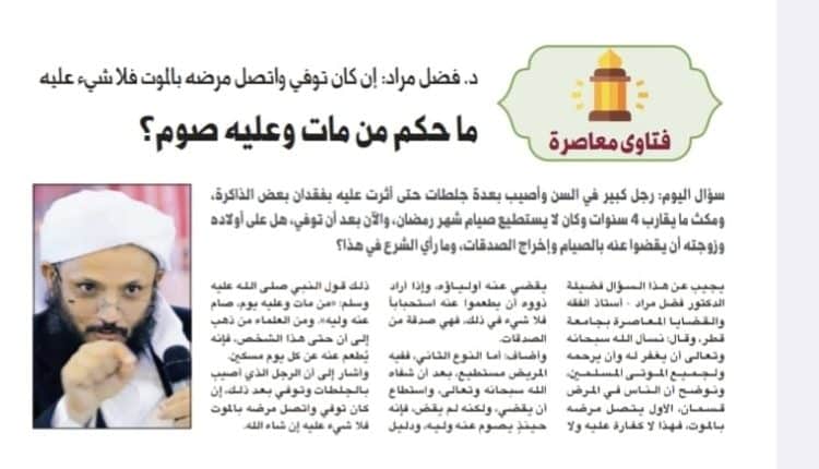 يجيب عن هذا السؤال فضيلة الدكتور فضل مراد – أستاذ الفقه والقضايا المعاصرة بجامعة قطر، وقال: نسأل الله سبحانه وتعالى أن يغفر له وأن يرحمه ولجميع الموتى المسلمين وتوضح أن الناس في المرض قسمان الأول يتصل مرضه بالموت، فهذا لا كفارة عليه ولا يقضي عنه أولياؤه، وإذا أراد دووه أن يطعموا عنه استحباباً فلا شيء في ذلك، فهي صدقة من الصدقات.