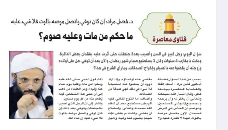 سؤال اليوم: رجل كبير في السن وأصيب بعدة جلطات حتى أثرت عليه بفقدان بعض الذاكرة ومكث ما يقارب 4 سنوات وكان لا يستطيع صيام شهر رمضان، والآن بعد أن توفي، هل على أولاده وزوجته أن يقضوا عنه بالصيام وإخراج الصدقات، وما رأي الشرع في هذا؟