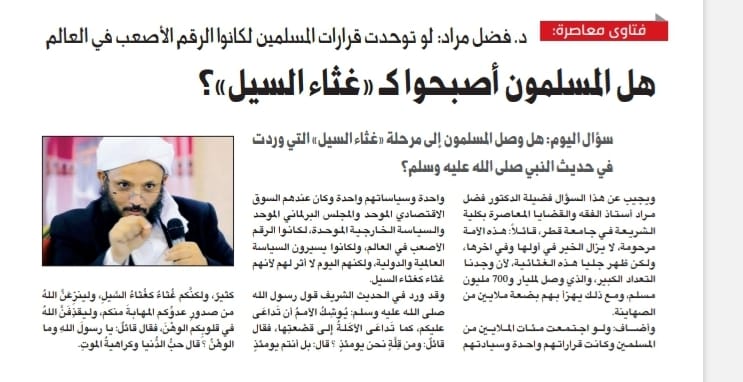 ويجيب عن هذا السؤال فضيلة الدكتور فضل مراد أستاذ الفقه والقضايا المعاصرة بكلية الشريعة في جامعة قطر، قائلاً : هذه الأمة مرحومة، لا يزال الخير في أولها وفي اخرها ولكن ظهر جليا هذه الغنائية، لأن وجدنا التعداد الكبير، والذي وصل المليار و 700 مليون مسلم، ومع ذلك يهزأ بهم بضعة ملايين من الصهاينة وأضاف ولو اجتمعت مئات الملايين من المسلمين وكانت قراراتهم واحدة وسيادتهم واحدة وسياساتهم واحدة وكان عندهم السوق الاقتصادي الموحد والمجلس البرلماني الموحد والسياسة الخارجية الموحدة، لكانوا الرقم الأصعب في العالم، ولكانوا يسيرون السياسة العالمية والدولية، ولكنهم اليوم لا أثر لهم لأنهم غناء كغتاء السيل.