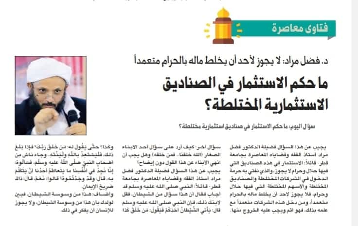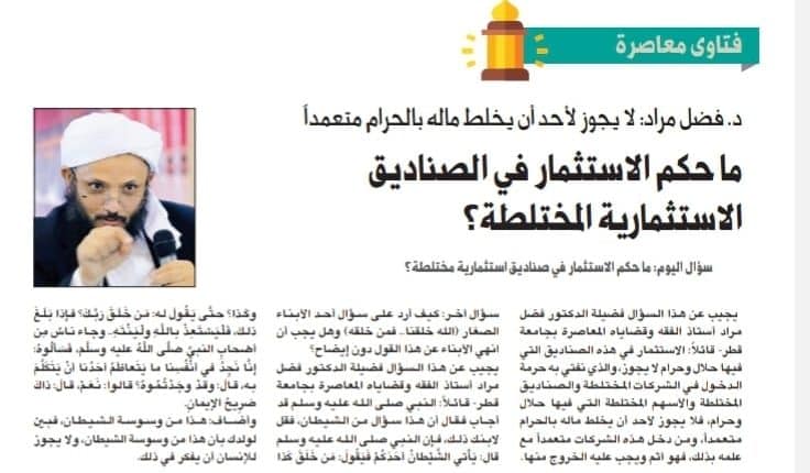 يجيب عن هذا السؤال فضيلة الدكتور فضل مراد استاذ الفقه وقضاياه المعاصرة بجامعة قطر قائلاً: الاستثمار في هذه الصناديق التي فيها حلال وحرام لا يجوز، والذي نفتي به حرمة الدخول في الشركات المختلطة والصناديق المختلطة والاسهم المختلطة التي فيها حلال وحرام، فلا يجوز لأحد أن يخلط ماله بالحرام متعمداً، ومن دخل هذه الشركات متعمداً مع علمه بذلك، فهو اتم ويجب عليه الخروج منها.