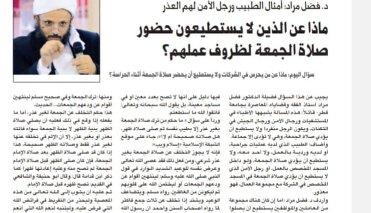 يجيب عن هذا السؤال فضيلة الدكتور فضل مراد استاذ الفقه وقضاياه المعاصرة بجامعة قطر قائلاً: هذه المسألة يشبهها الأطباء في المستشفيات ورجال الأمن ورجال الجيش في الثكنات، ويكون الرجل منفردا ولا يستطيع أن يؤدي صلاة الجمعة، وهي لا تؤدى إلا جماعة وأضاف الطبيب الذي لديه عمليات جراحية أو لديه وردية بالعمل، ولا أحد معه، ولا يستطيع أن يؤدي صلاة الجمعة، ولو داخل المسجد المخصص بالعمل، أو رجل الأمن الذي لا يستطيع أن يؤدي صلاة الجمعة في المسجد المخصص في الشركة مع مجموعة العمال، فهو معذور.